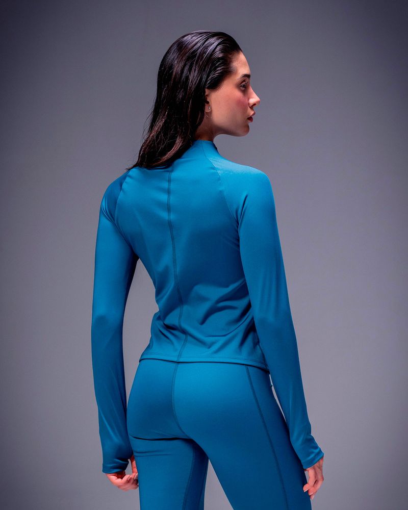 Chaqueta deportiva de silueta ajustada con mangas largas tipo ranglán y abertura tipo mitón para un mejor agarre. Cuenta con cuello integrado, cremallera separable al frente y cortes que realzan el ajuste al cuerpo. Diseño ideal para actividades de alto rendimiento o para tus sesiones en el gym.