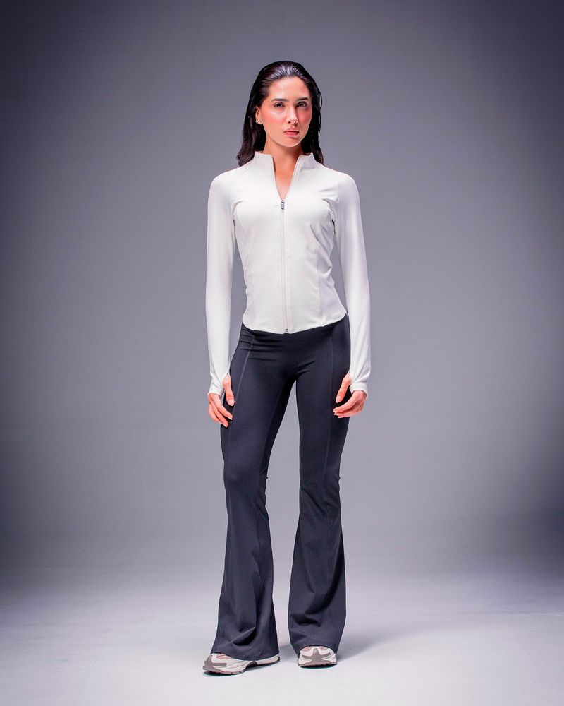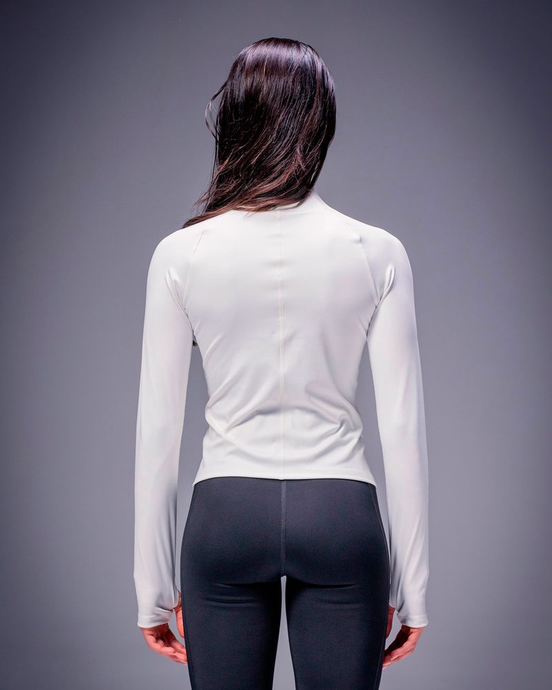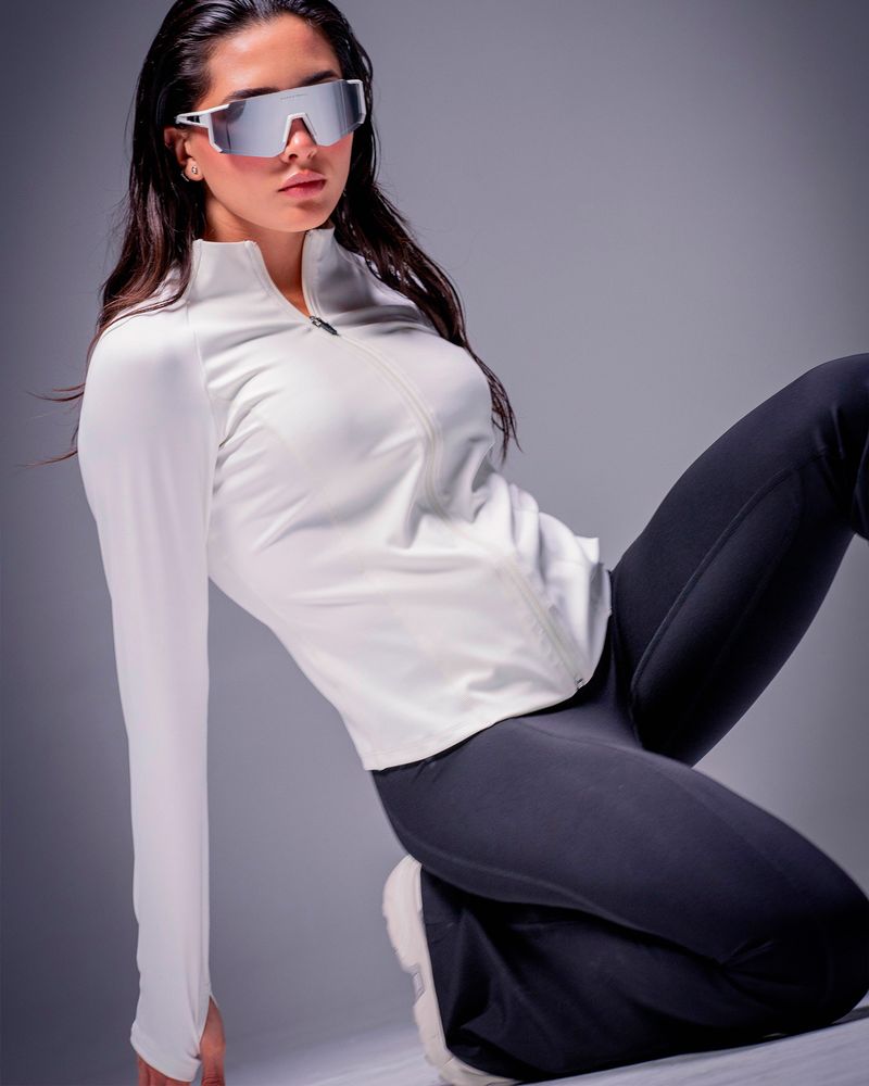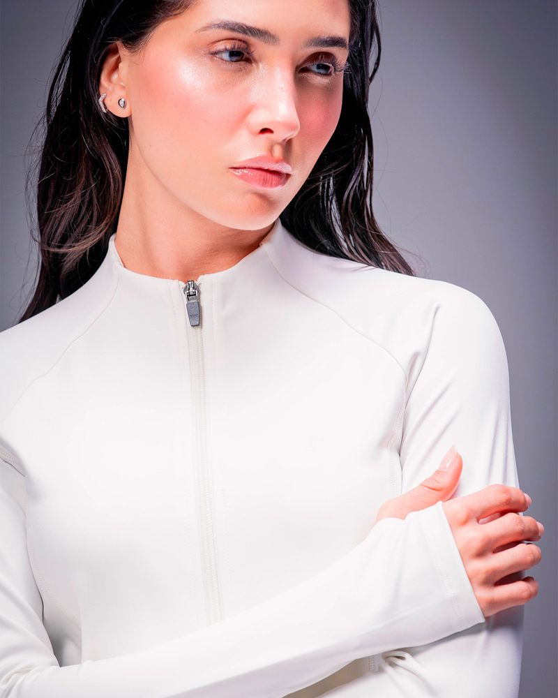Chaqueta deportiva de silueta ajustada con mangas largas tipo ranglán y abertura tipo mitón para un mejor agarre. Cuenta con cuello integrado, cremallera separable al frente y cortes que realzan el ajuste al cuerpo. Diseño ideal para actividades de alto rendimiento o para tus sesiones en el gym.