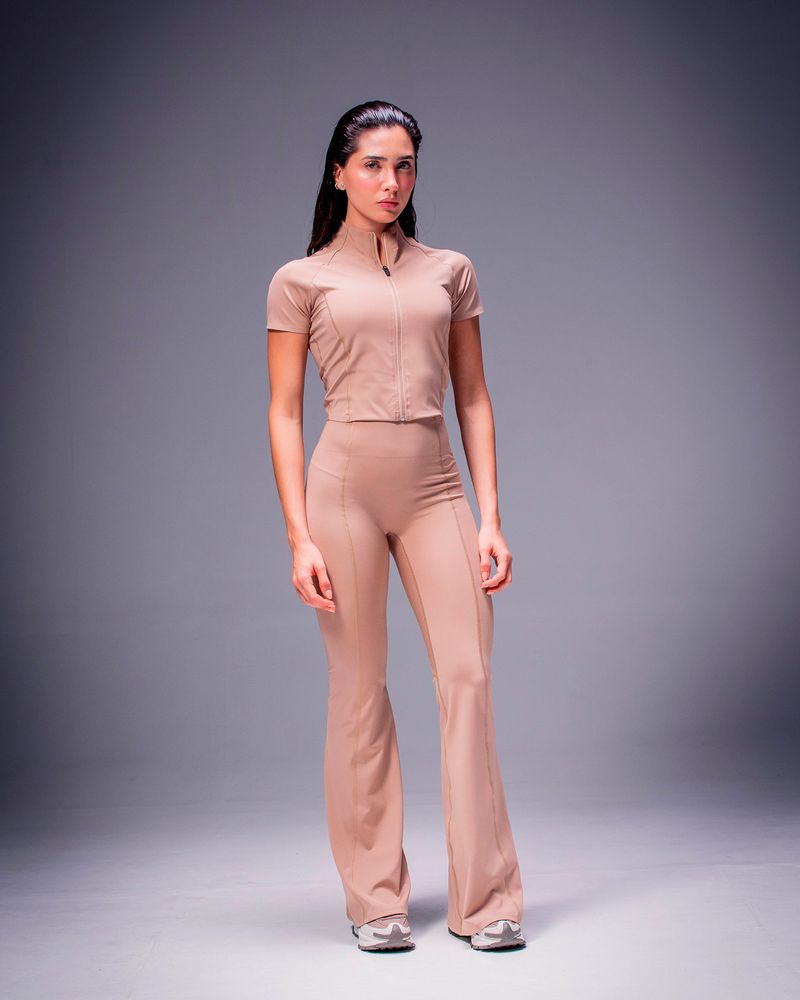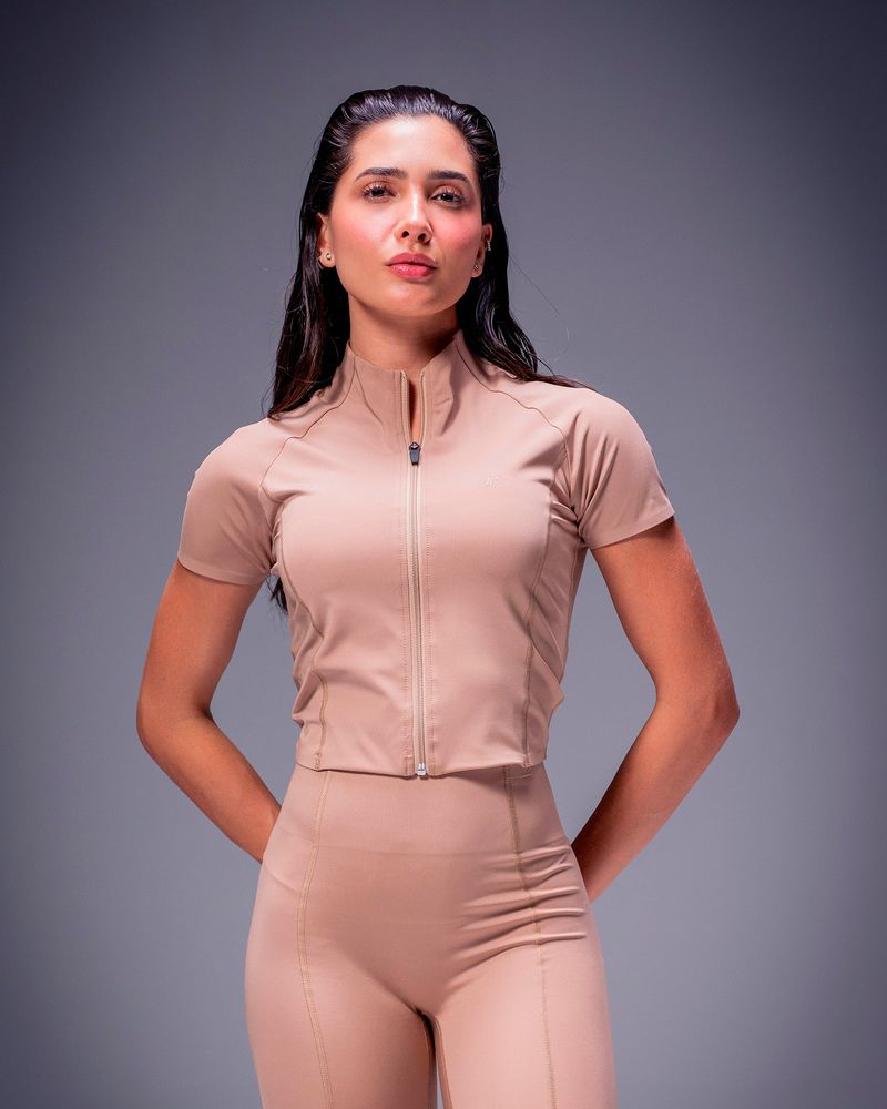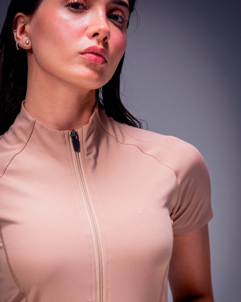 Crop Top Cuello Alto Con Cierre, Color ARENA Para Mujer