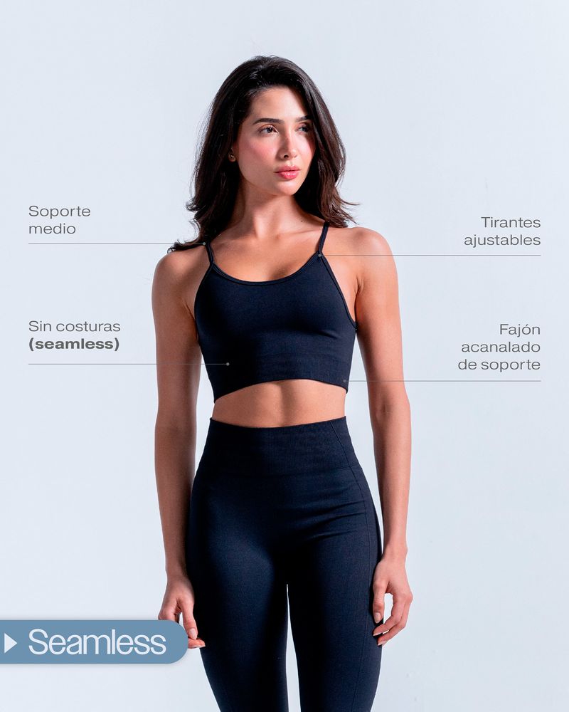 Top seamless con tirantes ajustables y soporte medio, elaborado en estructura acanalada en el fajón. Ideal para realizar cualquier actividad física. Su diseño funcional brinda apoyo y confianza al realizar ejercicios de alto impacto, yoga o entrenamientos fitness.